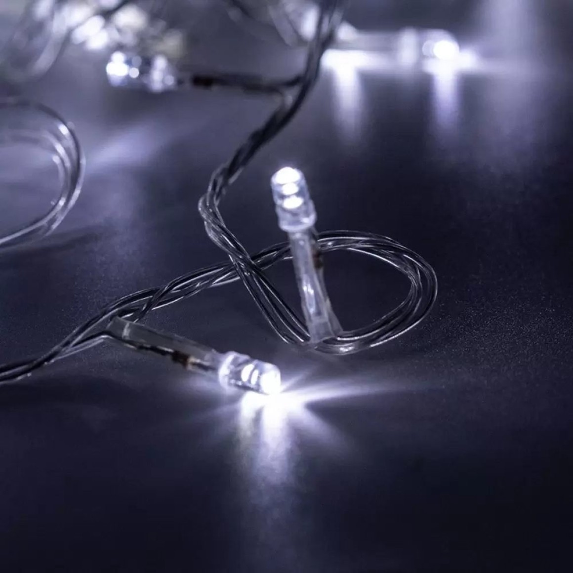 Cordão com 100 lâmpadas de led 220v na cor branco tendo 9 metros.