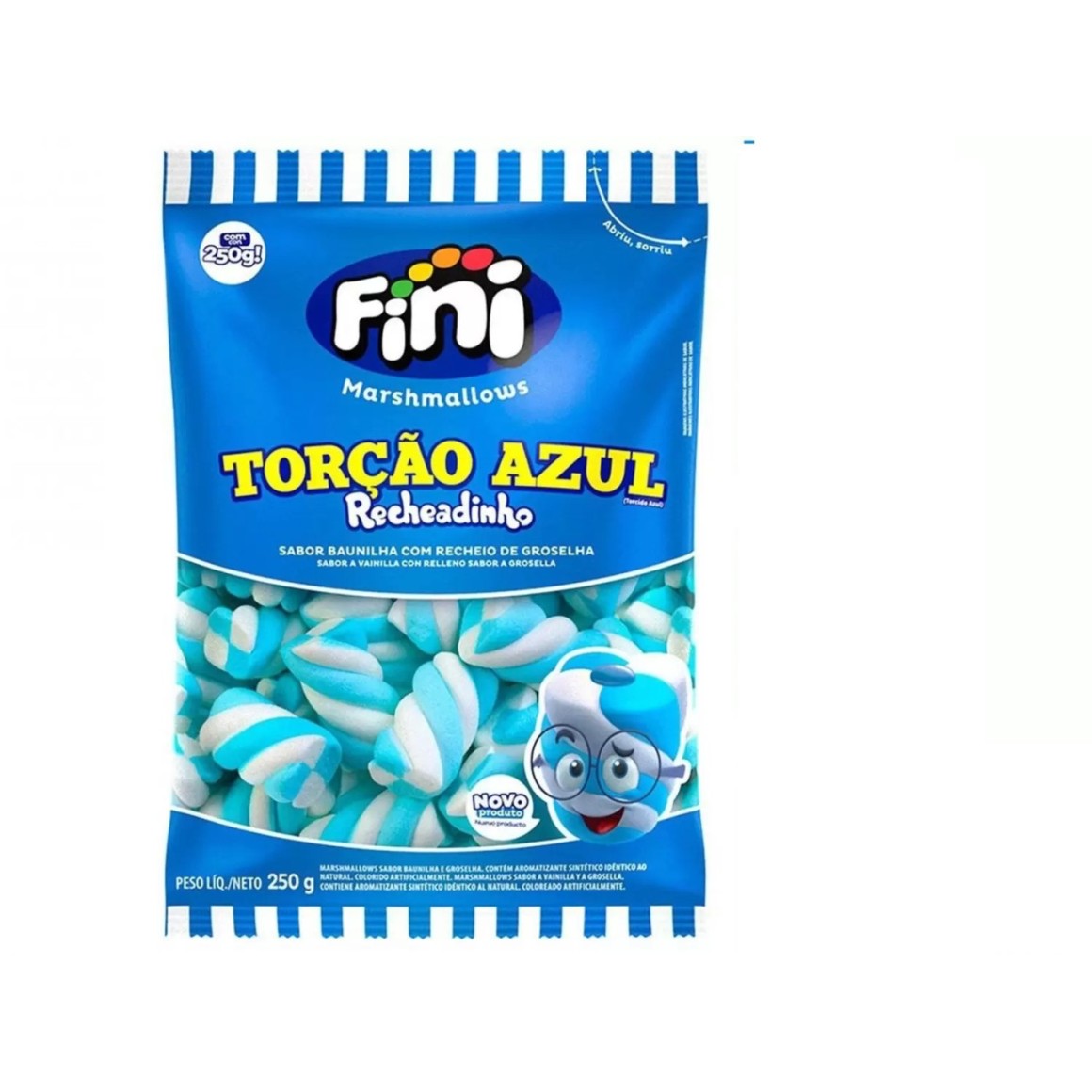 Deliciosos e macios marshmallows  em formato torcido, na cor azul com branca e no sabor de baunilha com recheio de groselha.