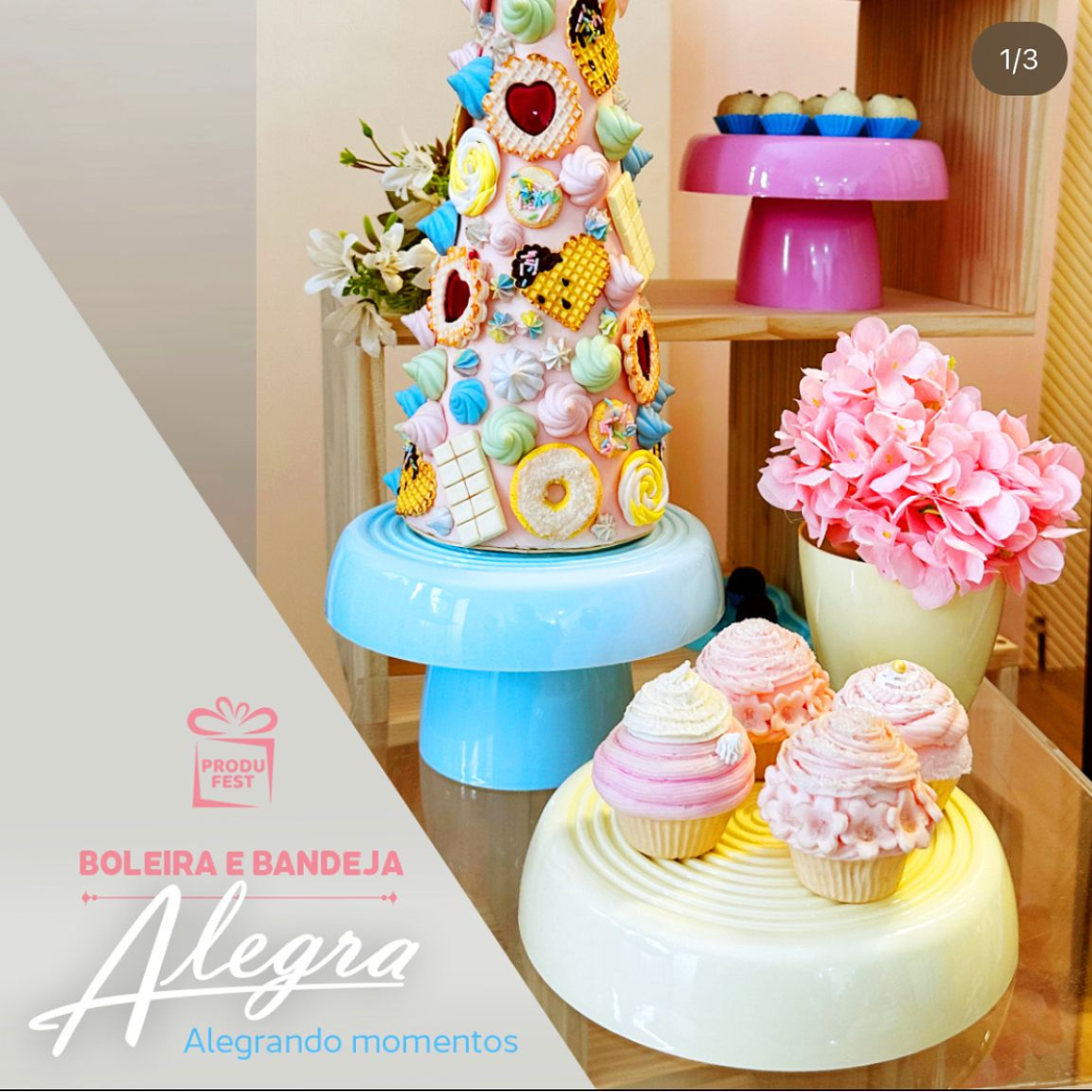 A boleira modelo Alegra é um sucesso para sua festa. Pode ser usada como decoração e manter o estilo até na hora de servir as delícias como docinhos, bolos e outras guloseimas.