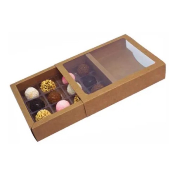 Caixa Gaveta para 12 Doces com Visor e Berço Kraft.