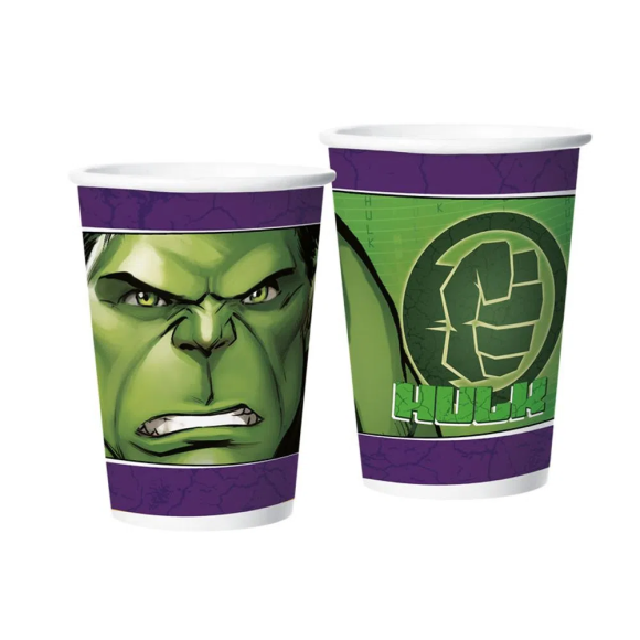 Utilize o copo Hulk Animação Regina para servir os convidados. Produzidos com papel impermeável e impressão de alta qualidade. O pacote vem com 8 unidades. Todos os copos possuem a capacidade de 180ml e são estampados com ilustrações da Hulk Animação.