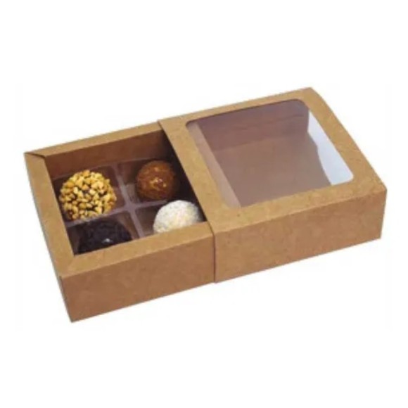 Caixa Gaveta para 4 Doces com Visor e Berço Kraft.