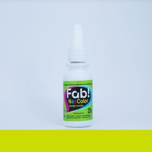 CORANTE NEOCOLOR 25G VERDE LIMÃO - FAB Ele é uma união dos corantes hidrossolúveis e lipossolúveis em uma única fórmula; possibilitando a aplicação tanto em bases aeradas, como chantilly, glacê, chantininho; e pastas de açúcar, como pasta americana, pasta elástica, etc. . Características