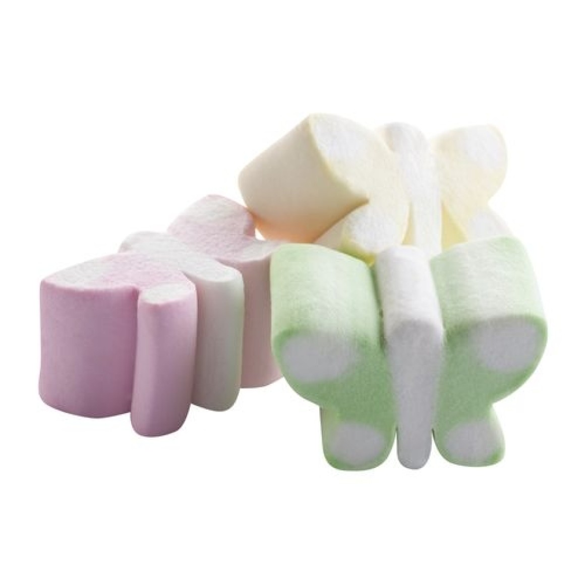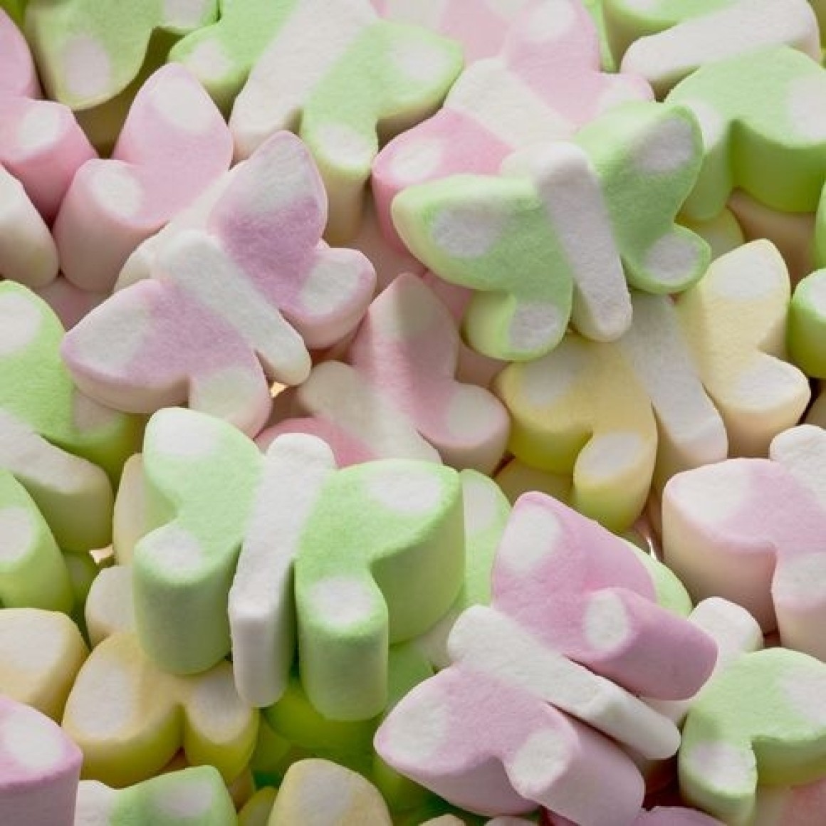 Marshmallow no formato de borboleta, nas cores amarelo, verde e rosa, no sabor de baunilha. Ideais para deixar dias mais saborosos, decorar festas, enfeitar pratos de confeitaria ou complementar o café.