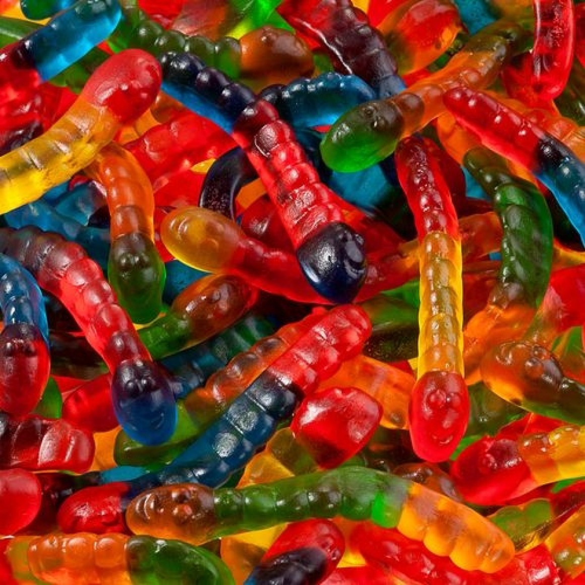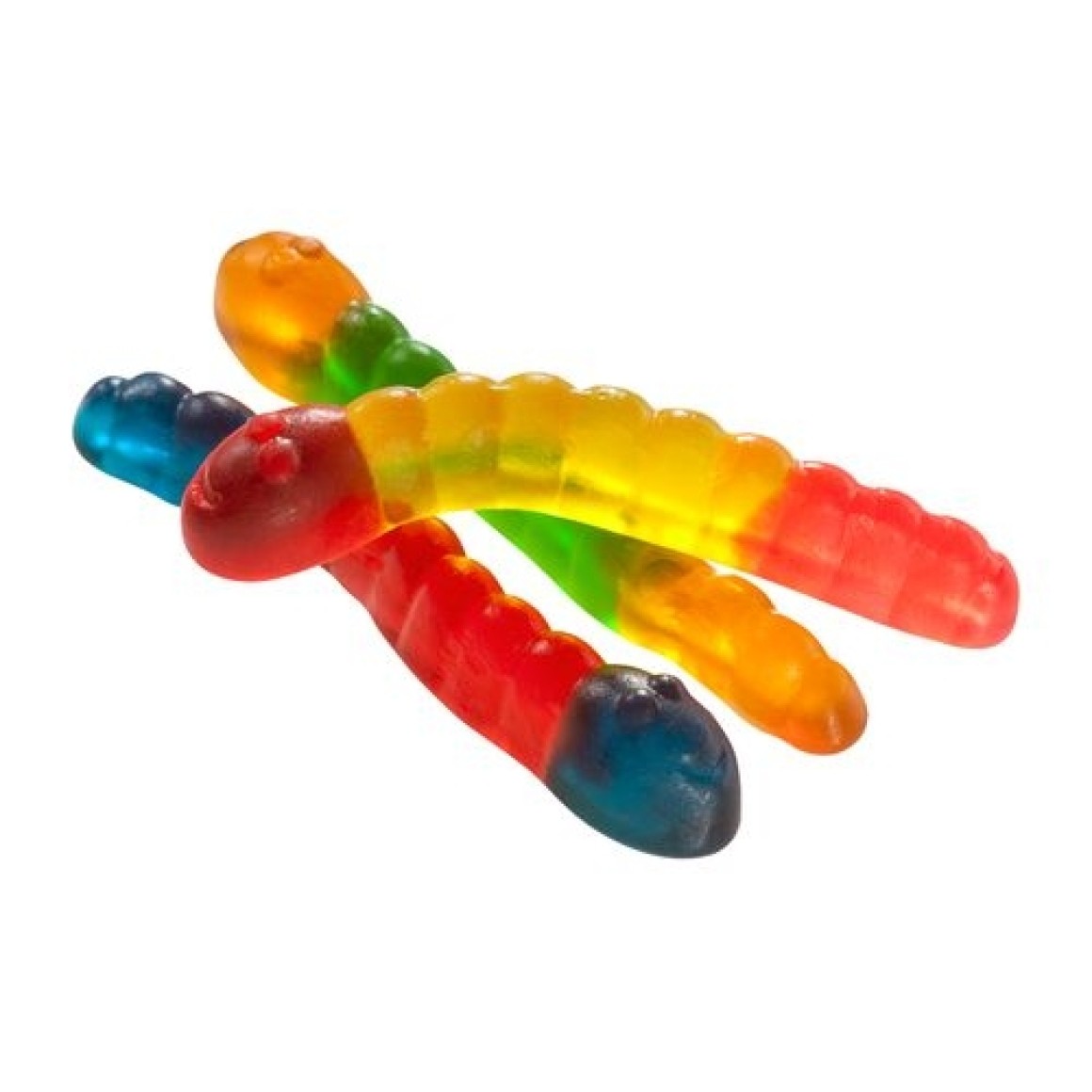 Balas de gelatina em formato de minhoca, nas cores vermelho, azul, amarelo, verde e laranja, nos sabores de laranja, framboesa, lima-limão, maçã verde e morango.